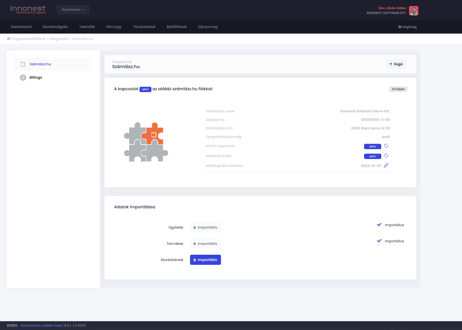 Az Innnonest az összekapcsoláskor automatikusan beállítja a számlázáshoz szükséges adatkapcsolatot, aminek köszönhetően két kattintással átemelhetők a Számlázz.hu-ból az Innonestbe az ügyfelek, a termékek és a felhasználók.