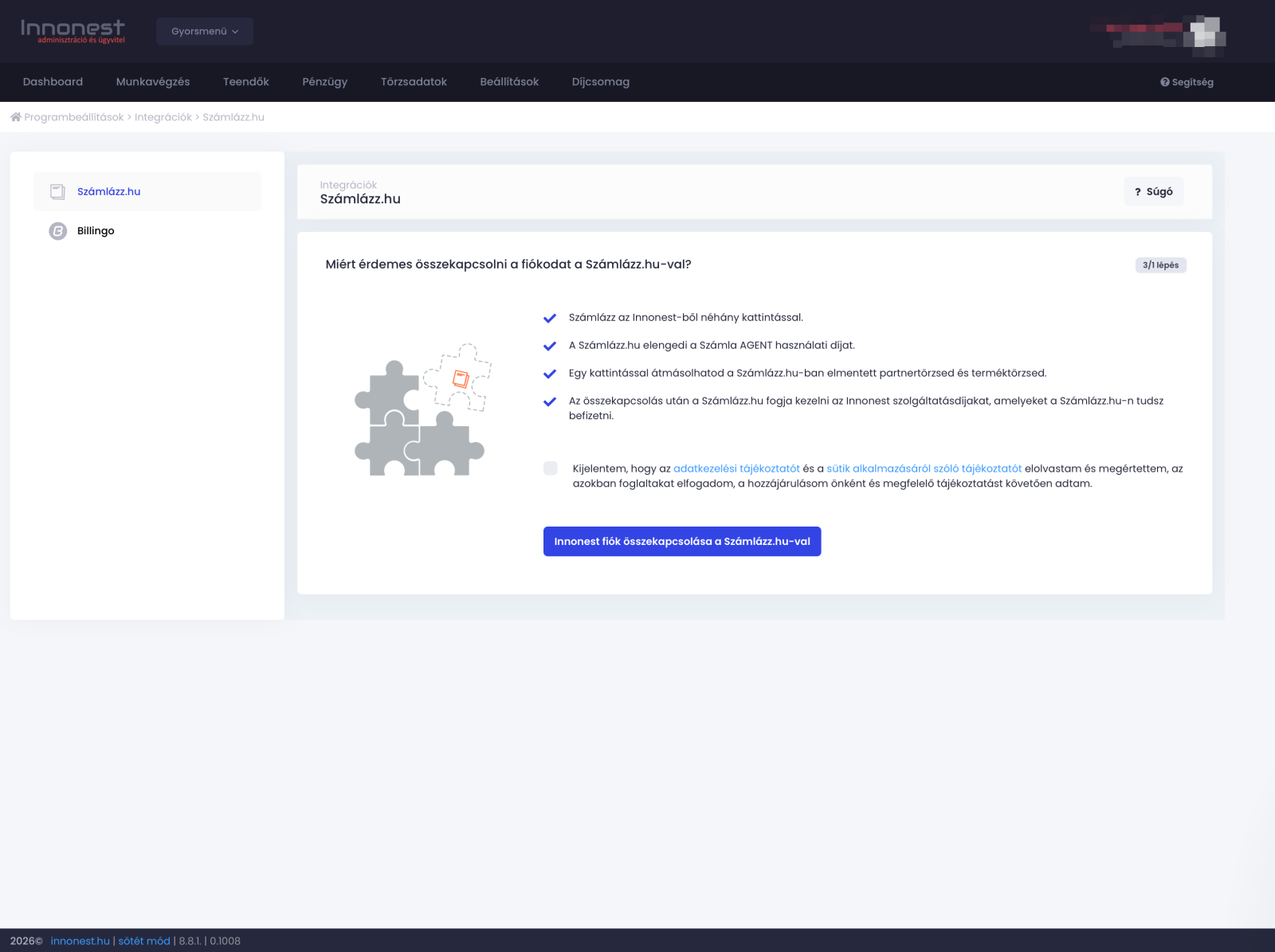 Amennyiben nem Számlázz.hu fiókkal regisztráltál, úgy a Beállítások - Integrációk menüpontba navigálj, majd válaszd a Számlázz.hu összekapcsolást, ahol pár lépésben összekötheted a rendszereket.